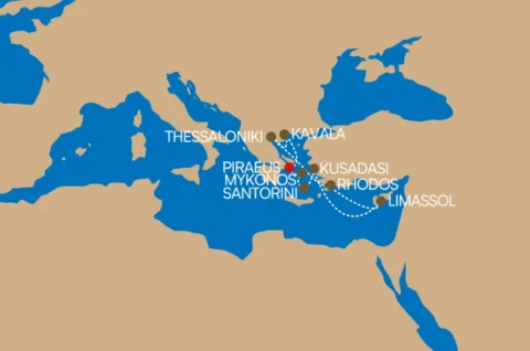 Kavala, Thessaloniki, Rhodes, Limassol, Kusadasi, Santorini, Mykonos
