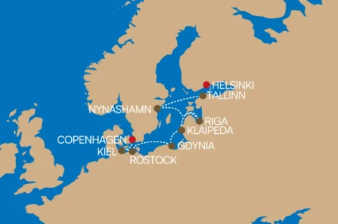Tallin, Nynashamn (Stockholm), Riga, Klaipeda, Gdynia, Rostock (Berlin), Kiel (Hamburg), Copenhagen